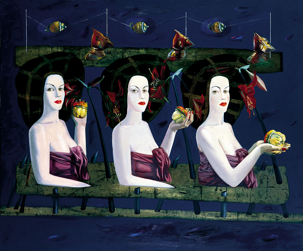 Мае даследаванні, пошук асацыятыўных сувязей сімвалаў у мастацкіх традыцыях ранейшых культурных цывілізацый дапамаглі выпрацаваць сваю знакавую сістэму твора. Знак «галаўны ўбор» перадае ўзаемасувязь вобраза з касмічнай эпохай. Такім чынам знак ператвараецца ў сімвал часу. Пры стварэнні вобраза галаўны ўбор падкрэслівае індывідуальныя прапорцыі твару. Але галаўны ўбор у маёй творчасці мае абагуленую, умоўную форму. I гэта дазваляе разам з перадачай у партрэце чыстых прапорцый свядома ствараць міфалагічнасць вобраза. Рэальны адбітак часу на палатне праз вобраз і знак вялікай абагуленасці дае магчымасць мастаку арганічна спалучаць сучаснасць з міфалагічнай культурнай прасторай.
