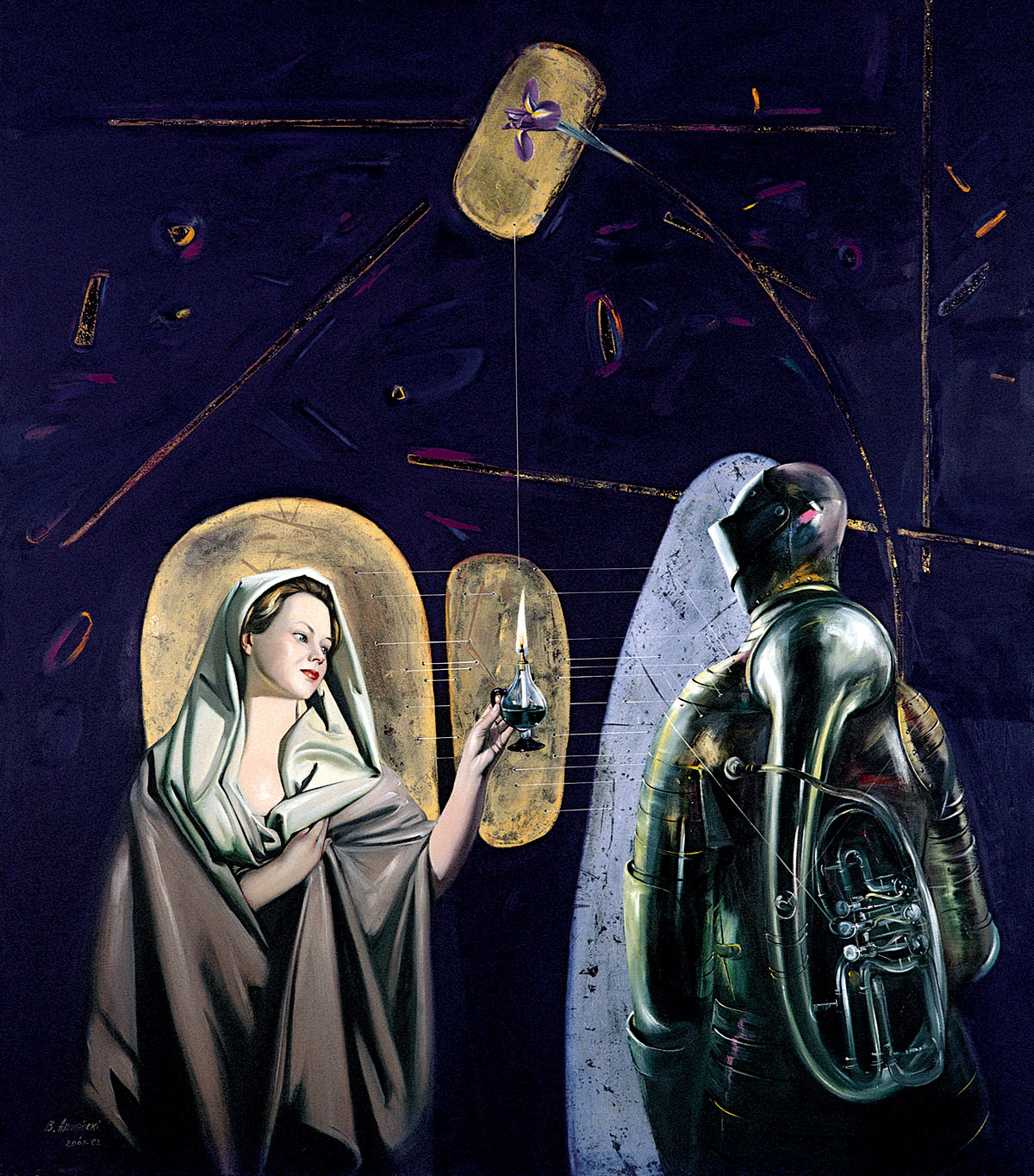 Для знакавай сістэмы маіх палотнаў важнейшымі сталі плоскасці з залатых пласцін. У жывапісе бадай што ва ўсе часы — ад пачатку сярэднявечча, у эпоху Адраджэння, у перыяд класіцызму,— а таксама ў іканапісе на палотнах абавязкова прысутнічала золата. Яно дадаткова стварала эфект ірэальнасці, іншага вымярэння.